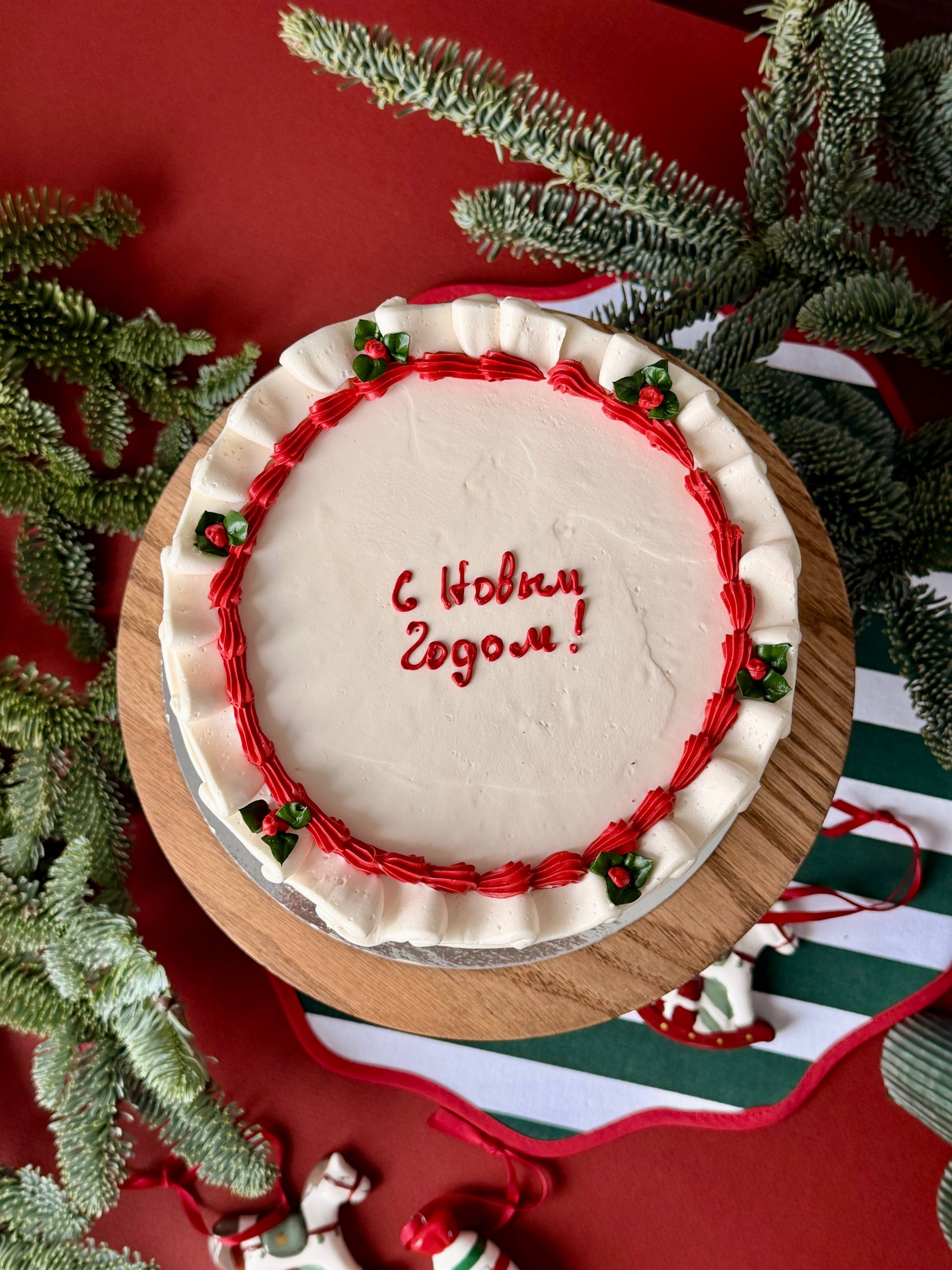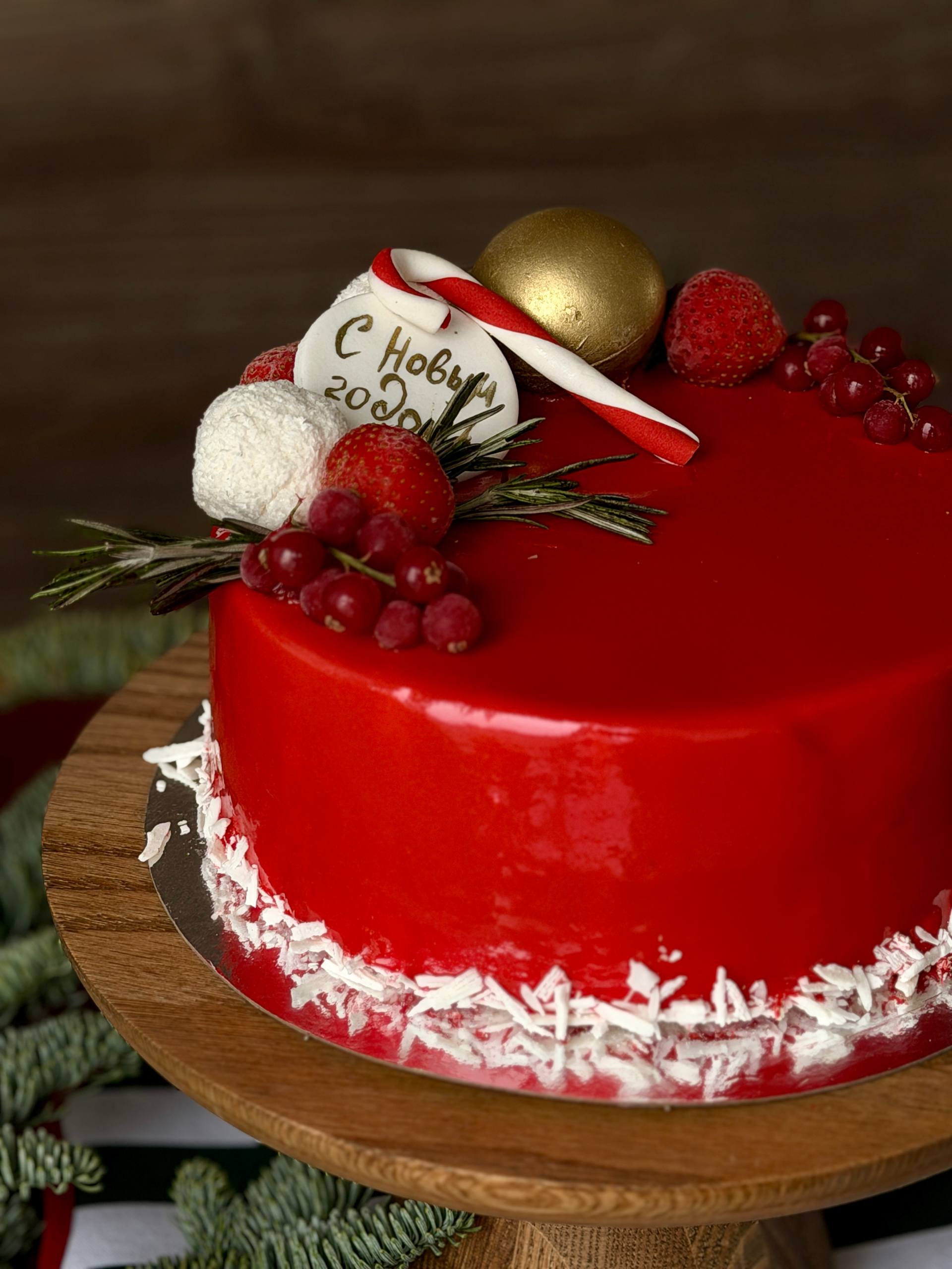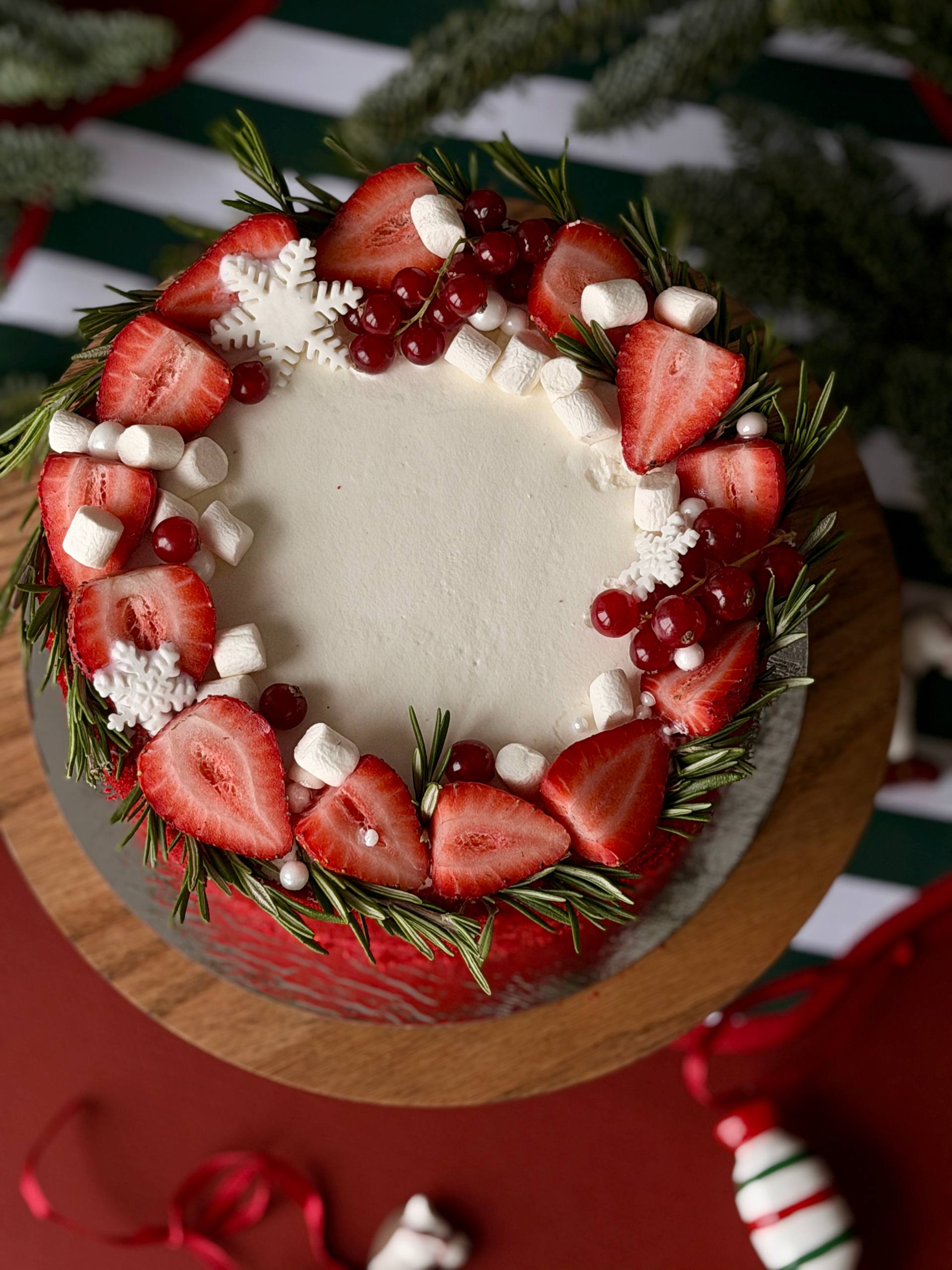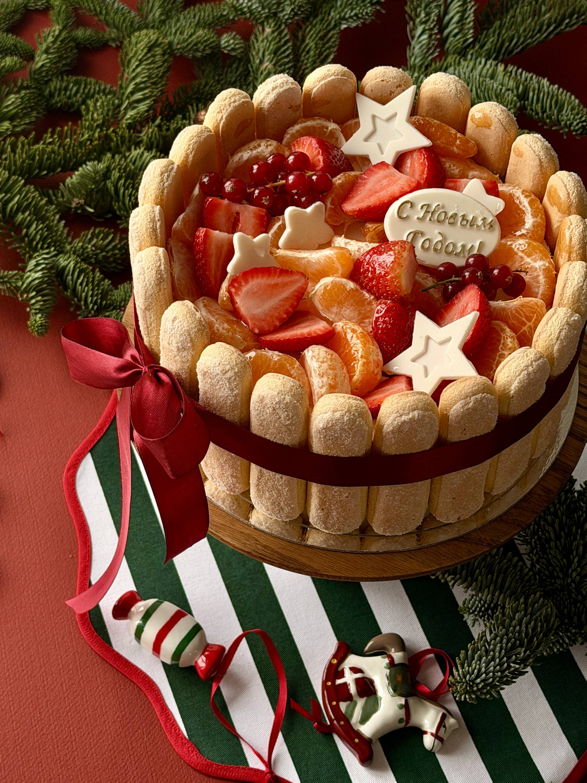 Ванильные коржи с нежным творожным кремом и ягодным конфи. Декор из шоколадных звезд, печенья савоярди, свежих ягод клубники и цитрусов.