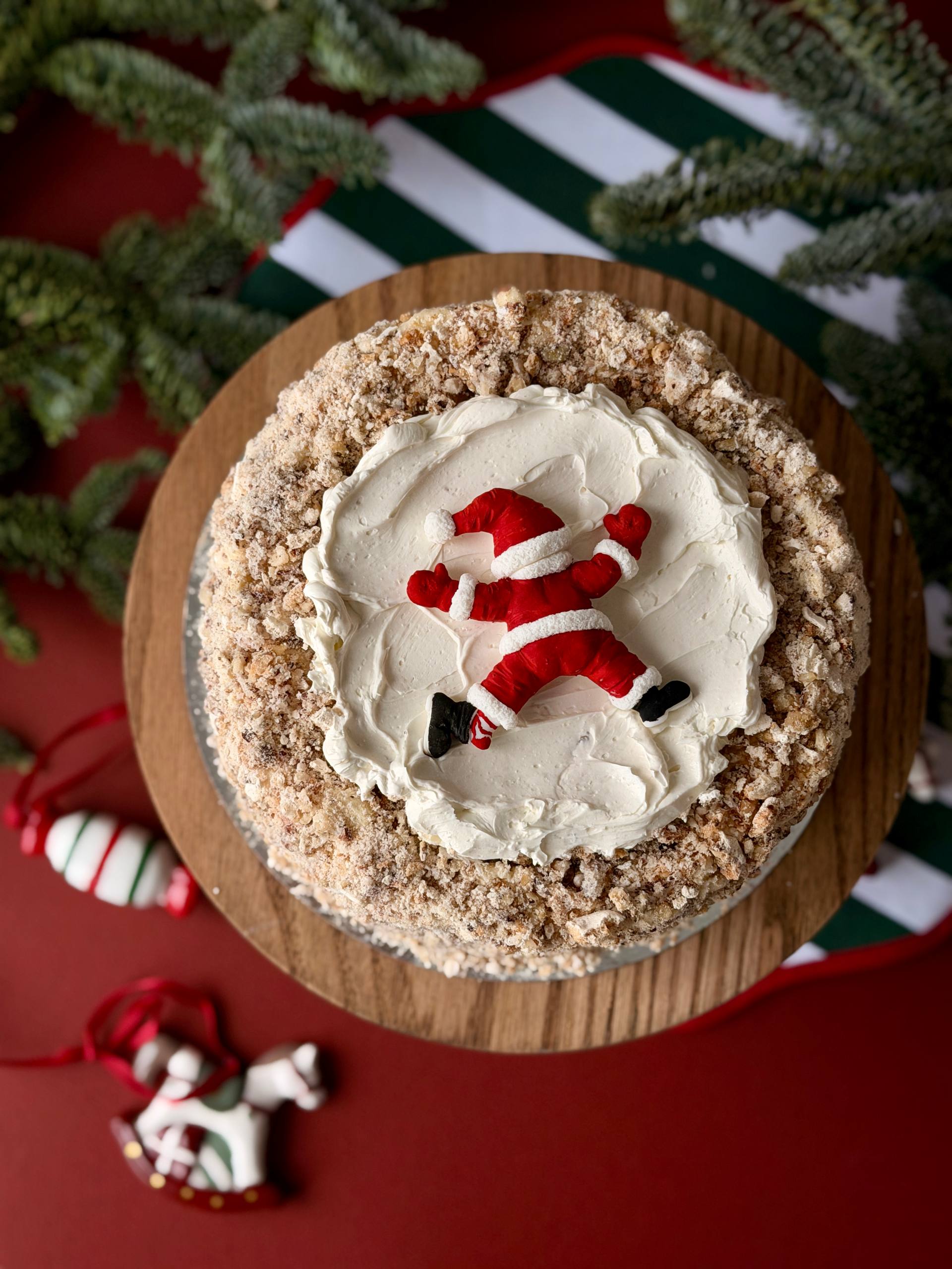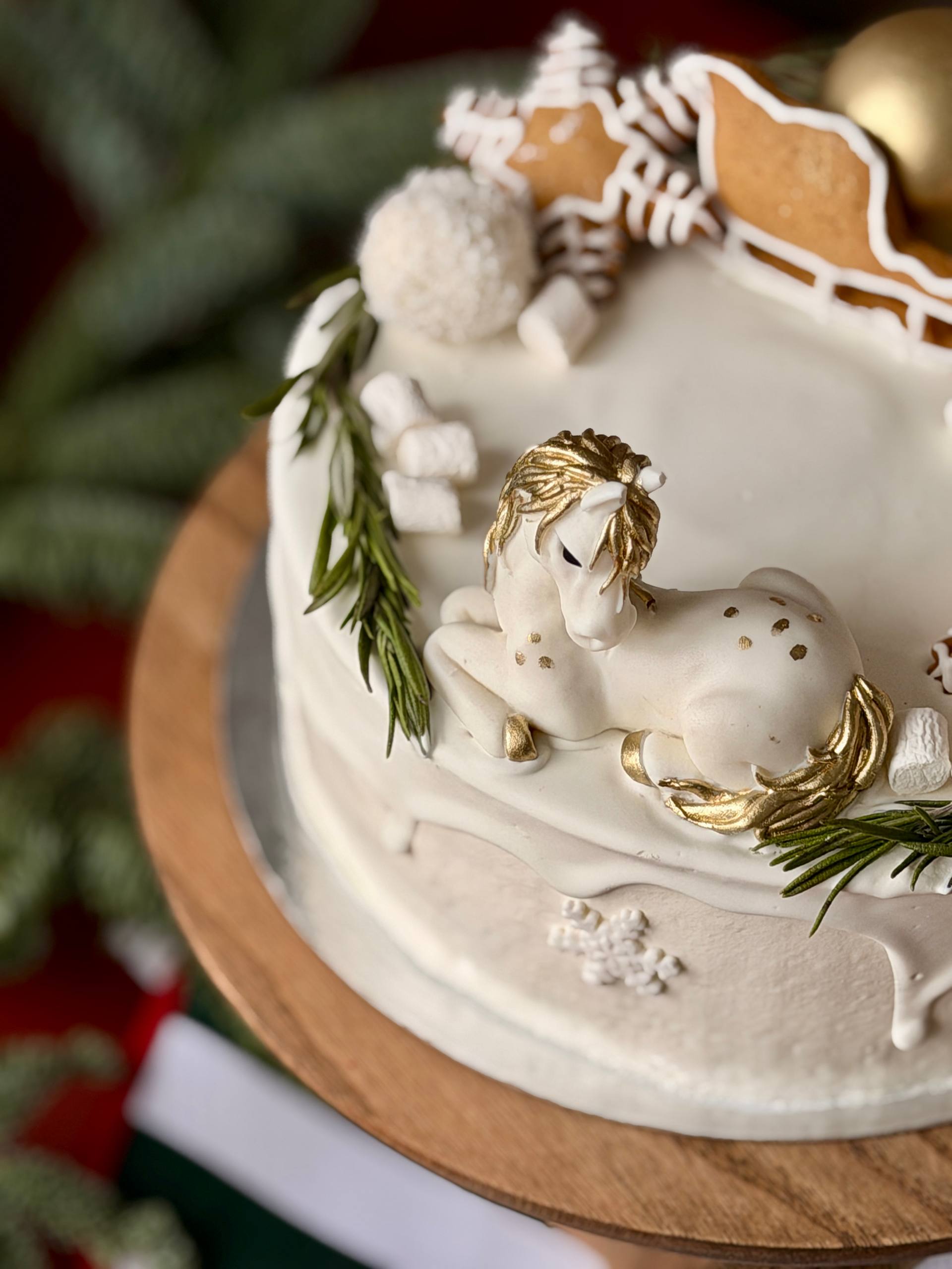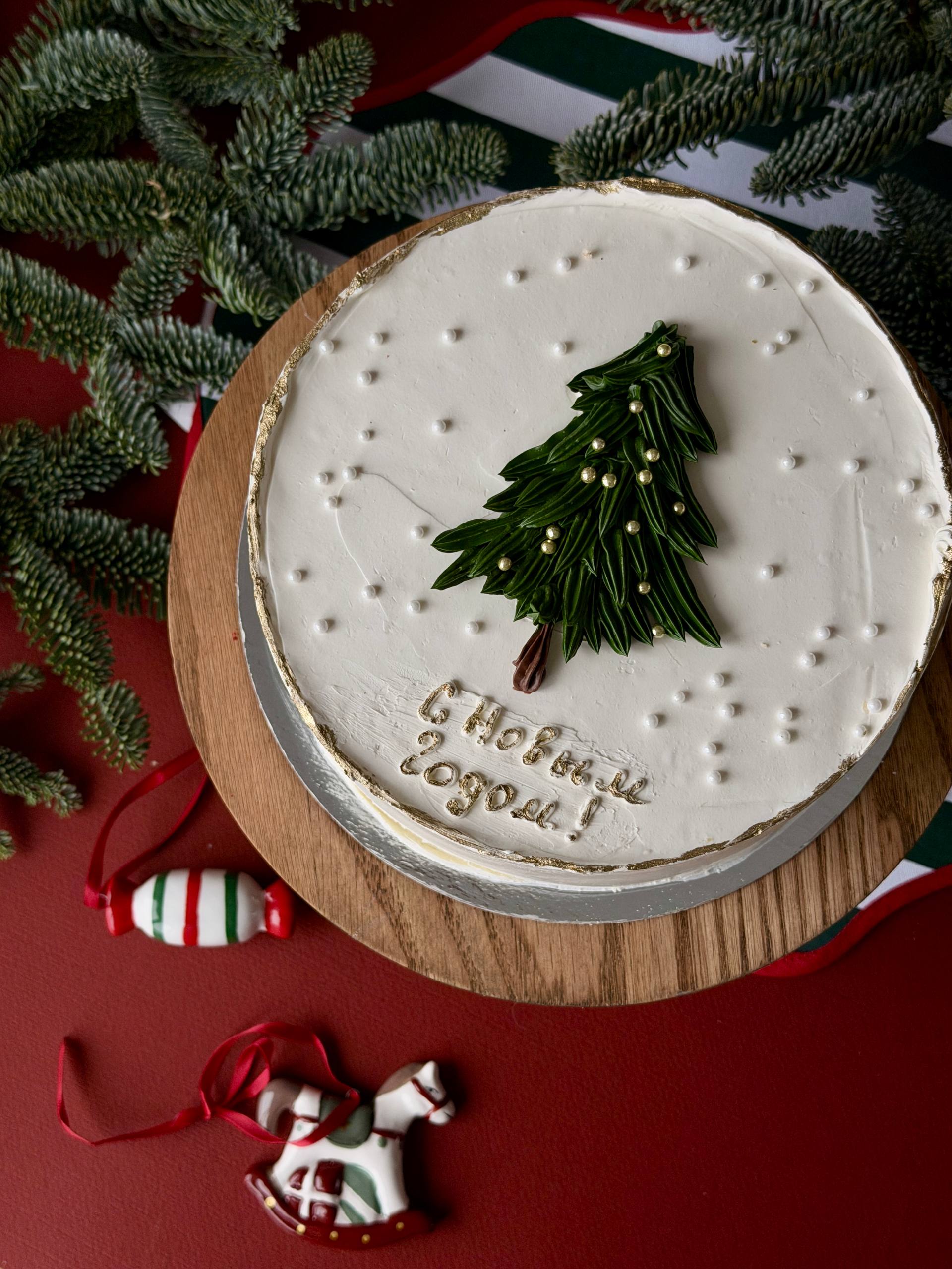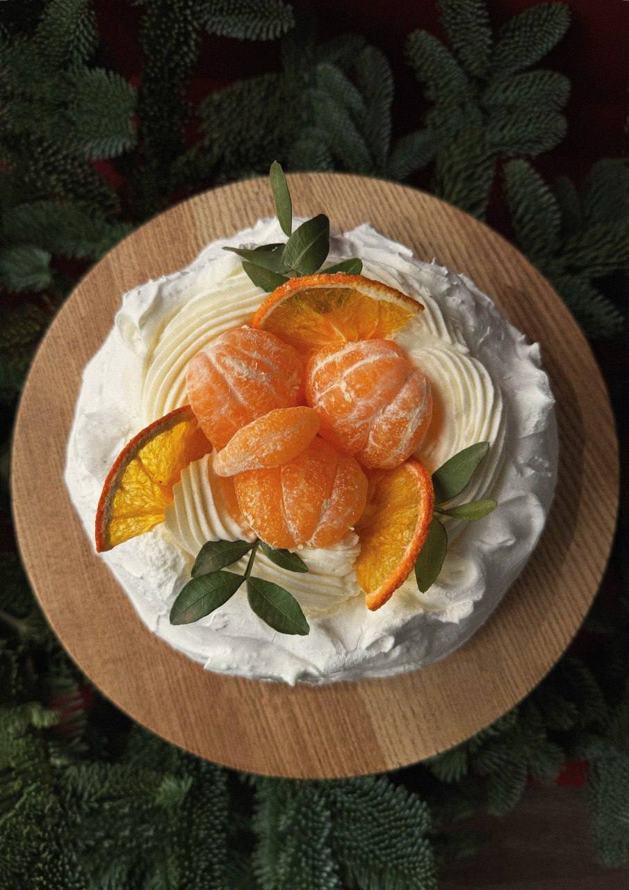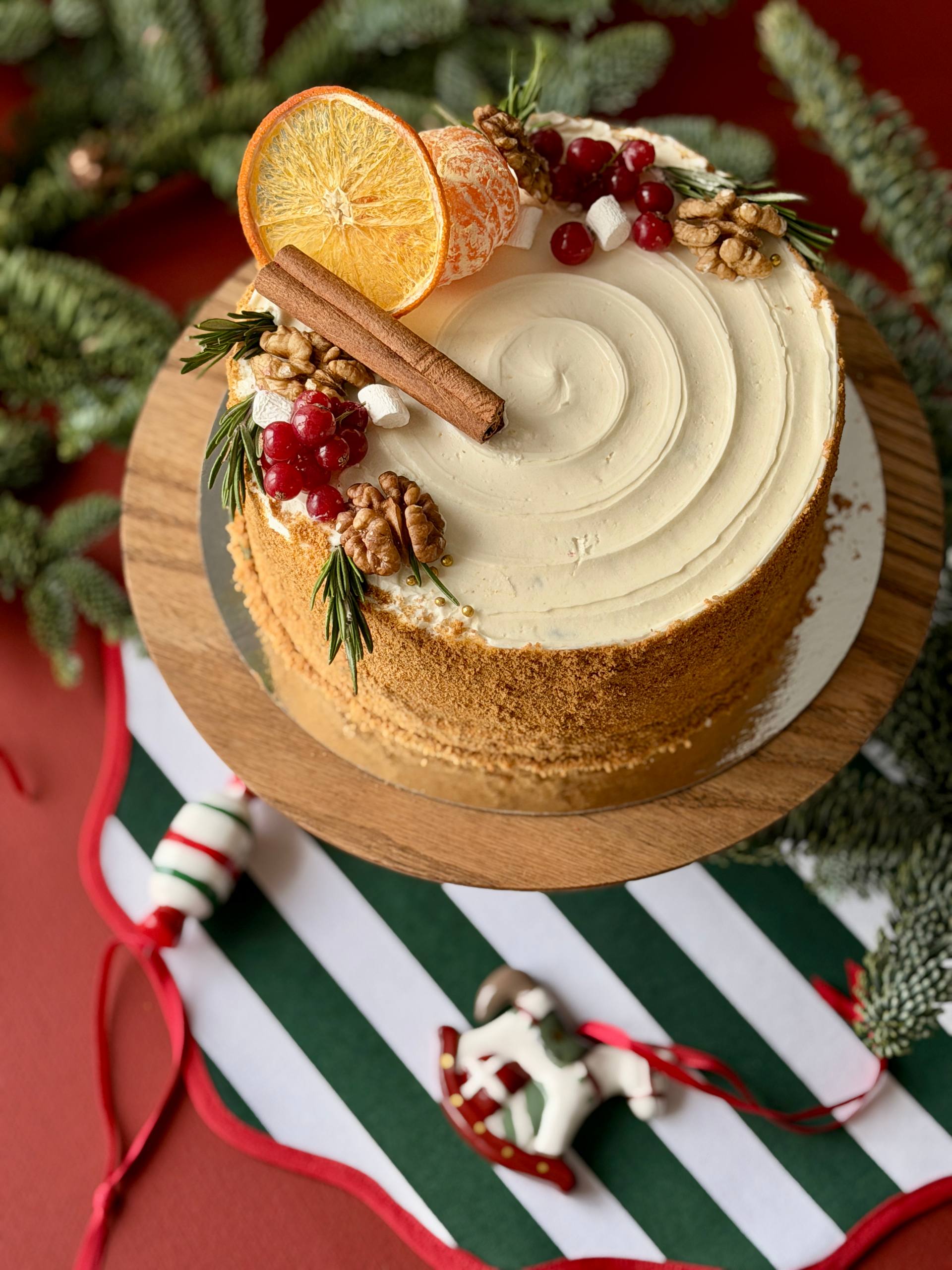Ванильные коржи с нежным творожным кремом и ягодным конфи. Декор из шоколадных звезд, печенья савоярди, свежих ягод клубники и цитрусов.